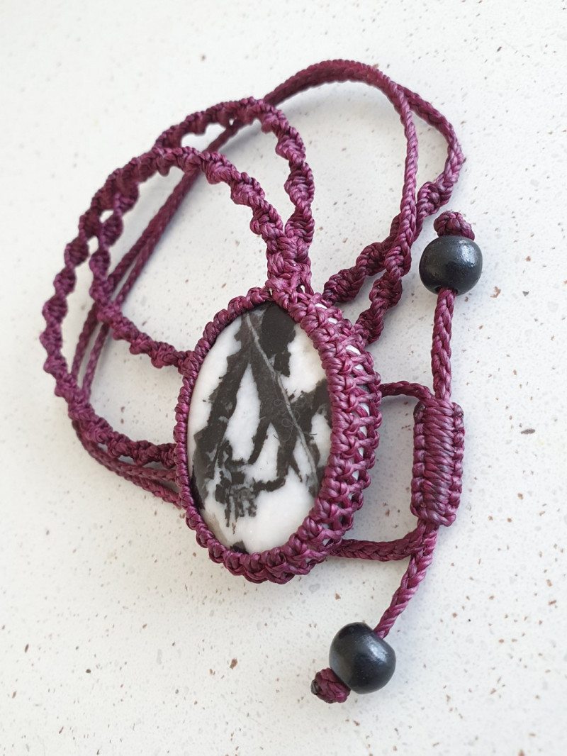 Zebra Jasper crystal necklace and wooden beads with black cherry adjustable macramé cord.