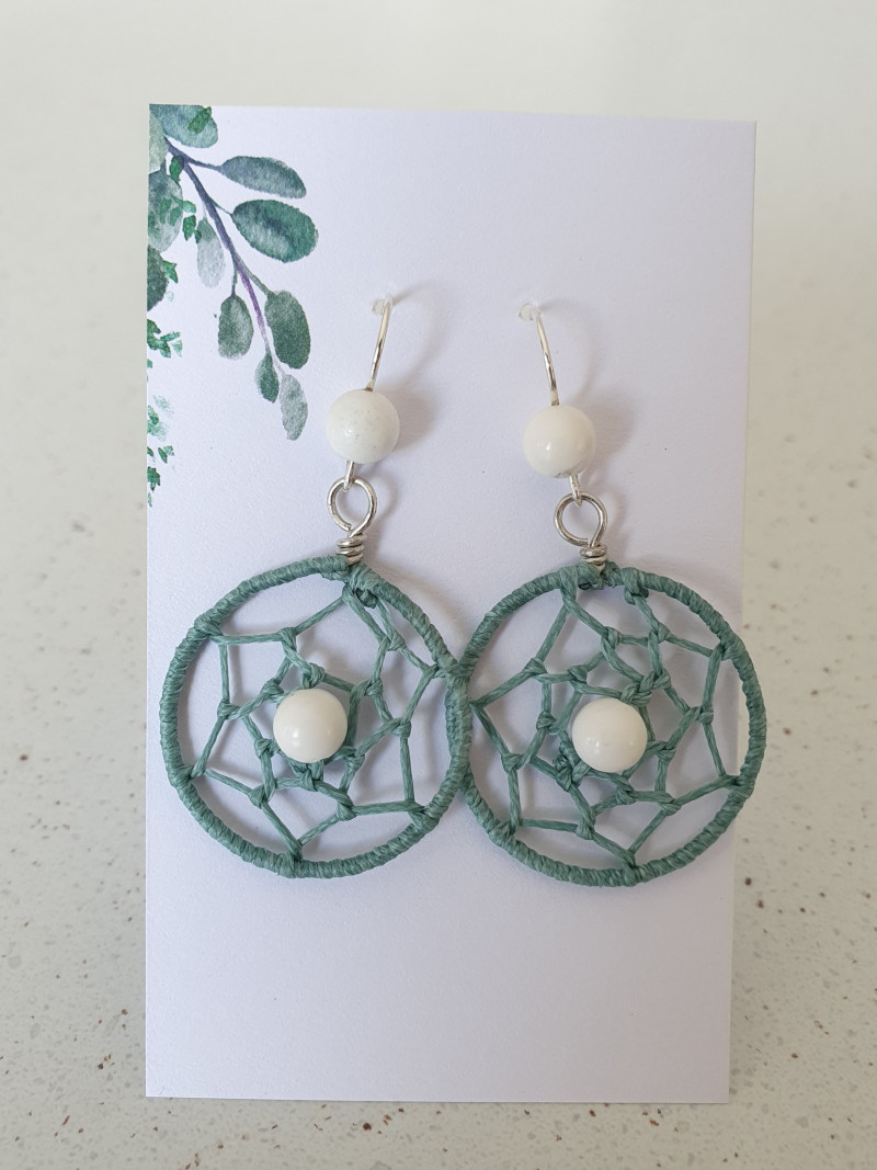 Dream catcher earrings with Magnesite crystal and mint green macrame cord. Made with Stirling Silver ear wires.