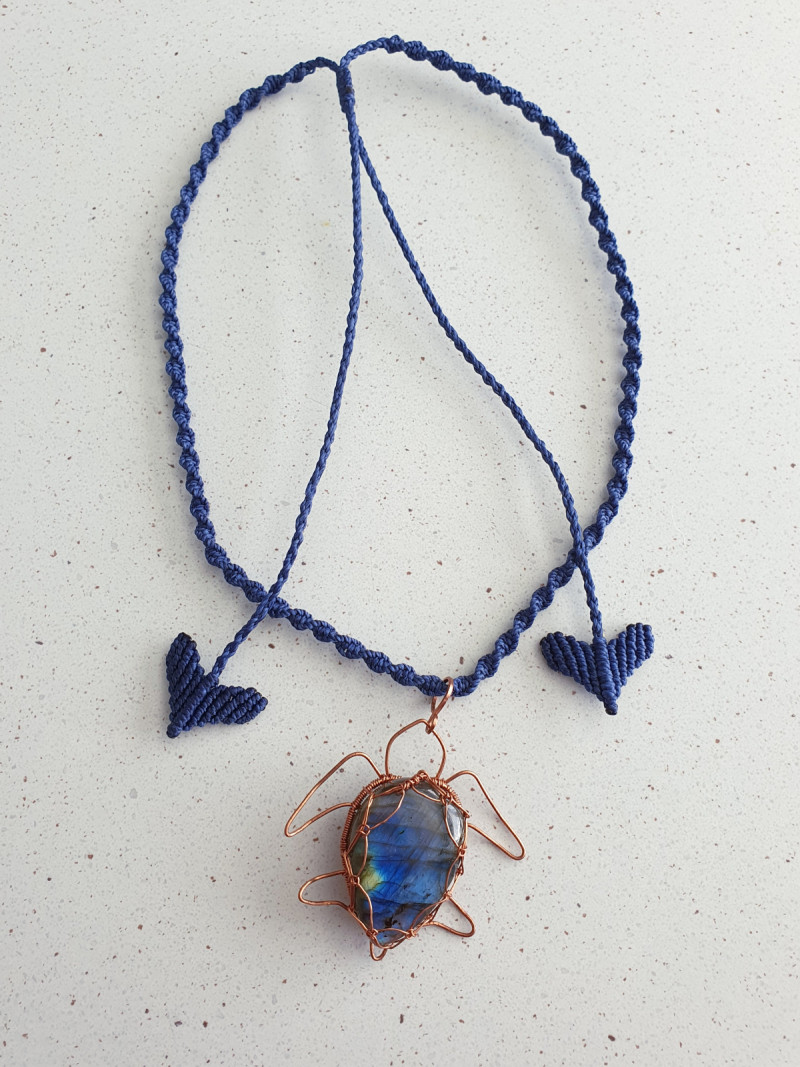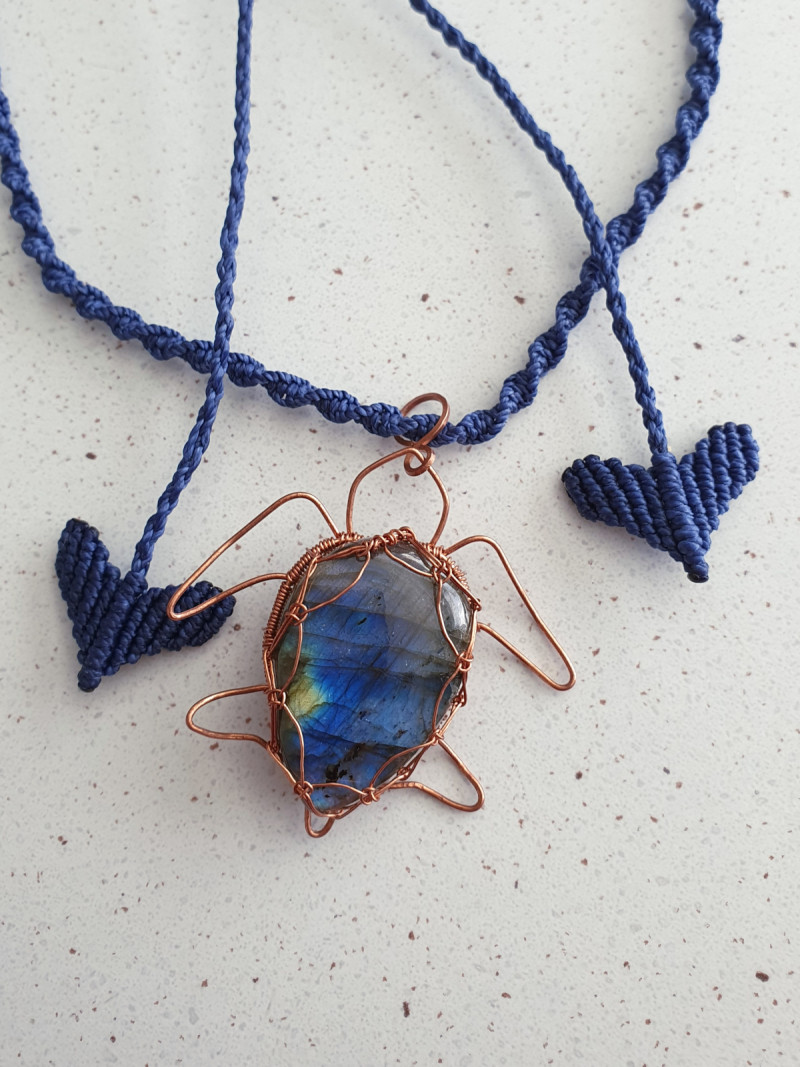 Labradorite crystal wrapped in a copper turtle pendant with adjustable blue narrow spiral macrame cord and heart shaped toggles