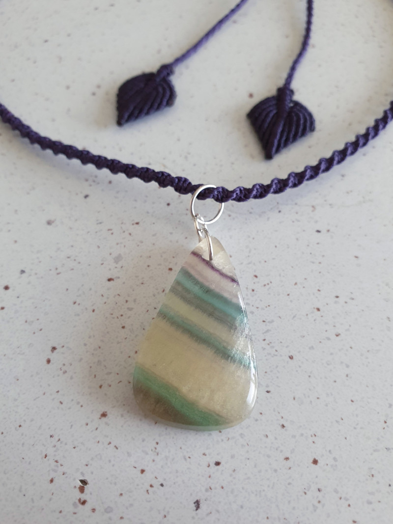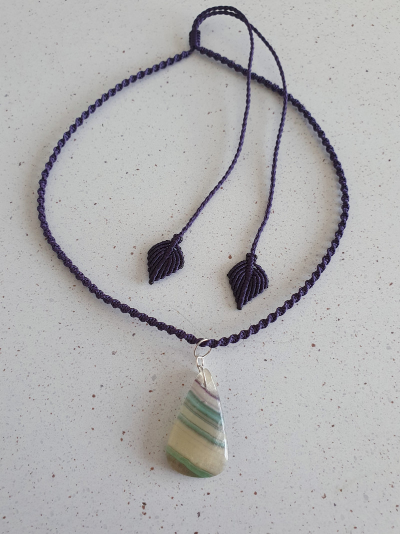 Rainbow fluorite crystal with stirling silver findings and a dark purple narrow spiral adjustable macrame necklace with leaf shaped toggles