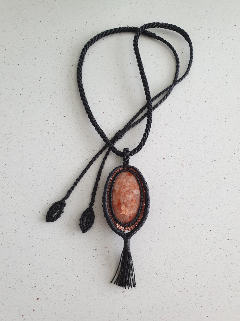 Sunstone crystal pendant with two toned coral and black adjustable macrame cord.