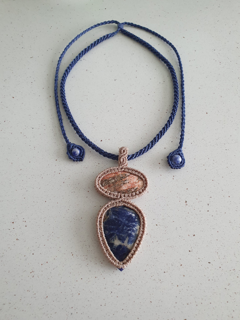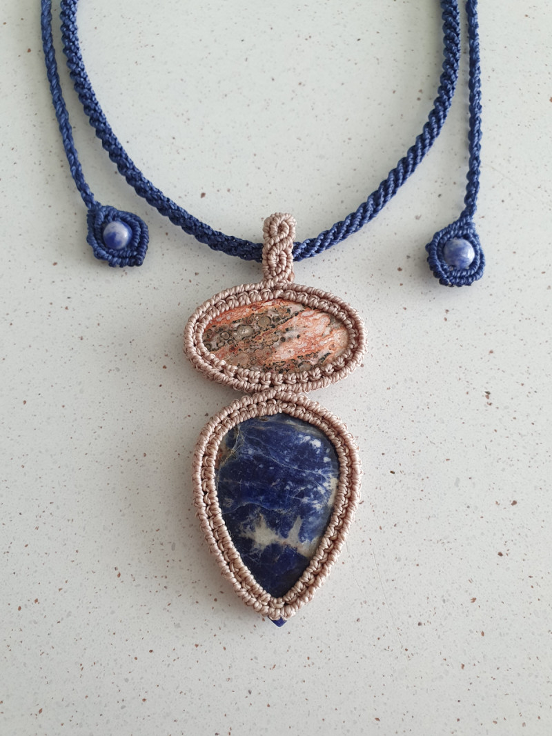 Sodalite and Ocean Jasper crystal dual stone combination wrapped with pale brown macrame cord and navy double spiral adjustable macrame cord.