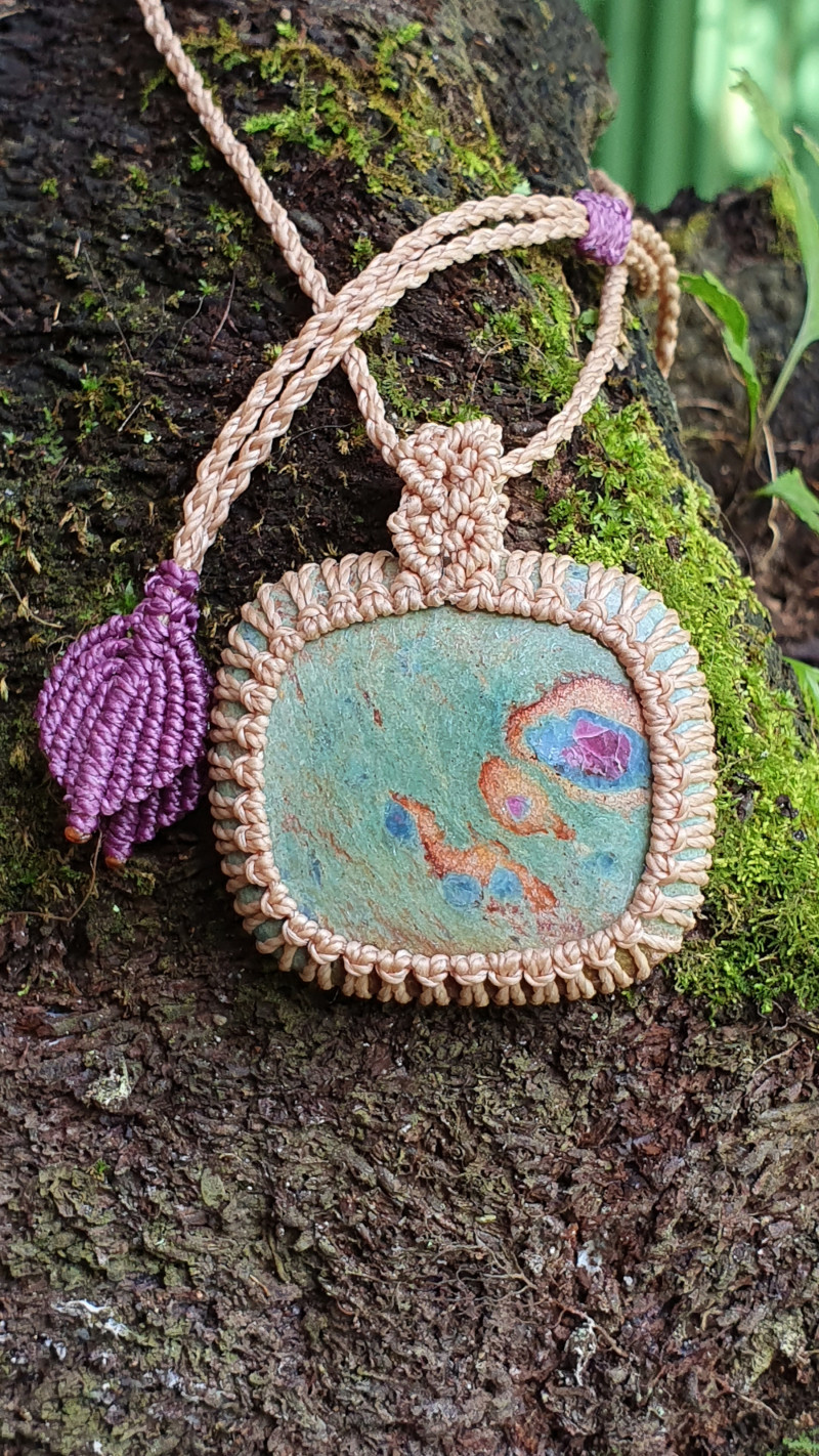 Ruby Fuchsite cabochon crystal combined with tan adjustable macrame cord and ruby leaf detail toggles.