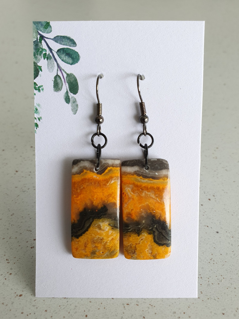 One-of-a-kind matched pair of Bumblebee Jasper crystal earrings. Made with nickel free gunmetal black ear wires and findings.