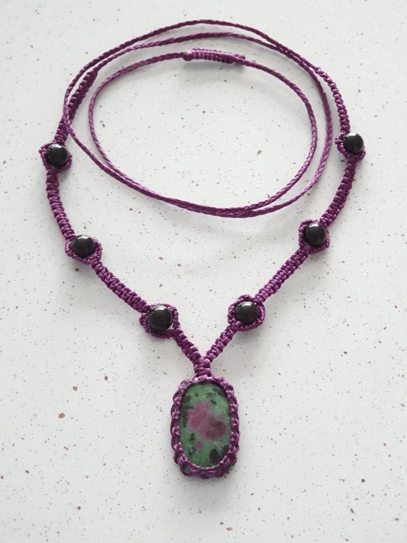 Ruby Zoisite crystal and 6 x black Onyx beads with plum coloured adjustable macramé cord.