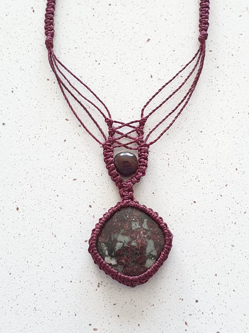 Eudialyte crystal and garnet tumble with black cherry coloured macramé cord.
