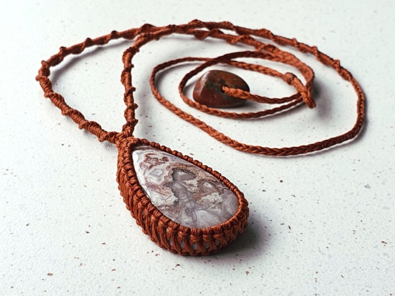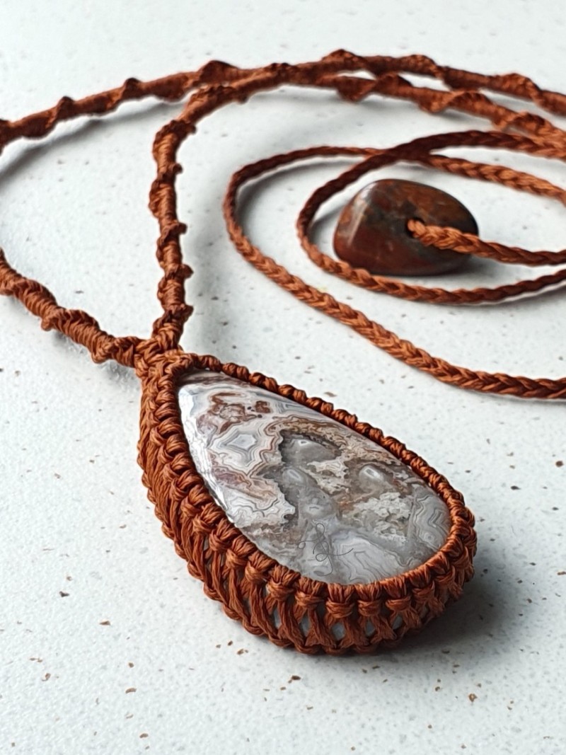 Crazy Lace Agate crystal and natural stone toggle with burnt copper wide spiral macramé cord.