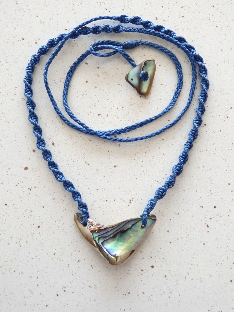 Paua shell necklace and toggle with lapis blue narrow spiral macramé cord.