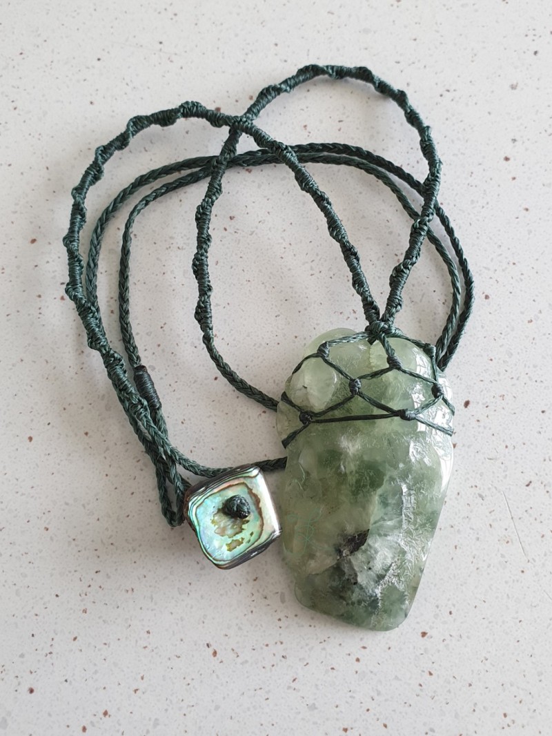 Prehnite slice crystal and Paua toggle with dark green wide spiral macramé cord.