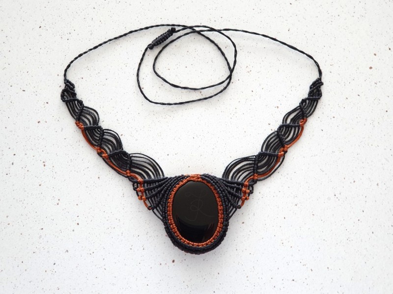 Black Obsidian crystal necklace with adjustable black and burnt copper macramé cord