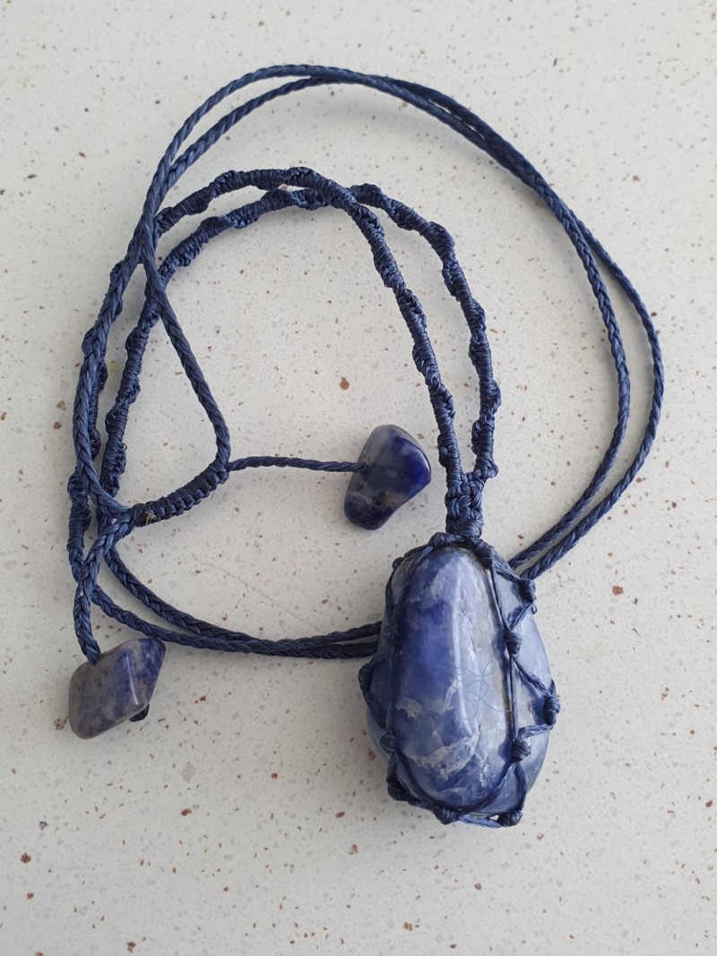 Sodalite crystal and beads necklace with navy blue wide spiral adjustable macramé cord.