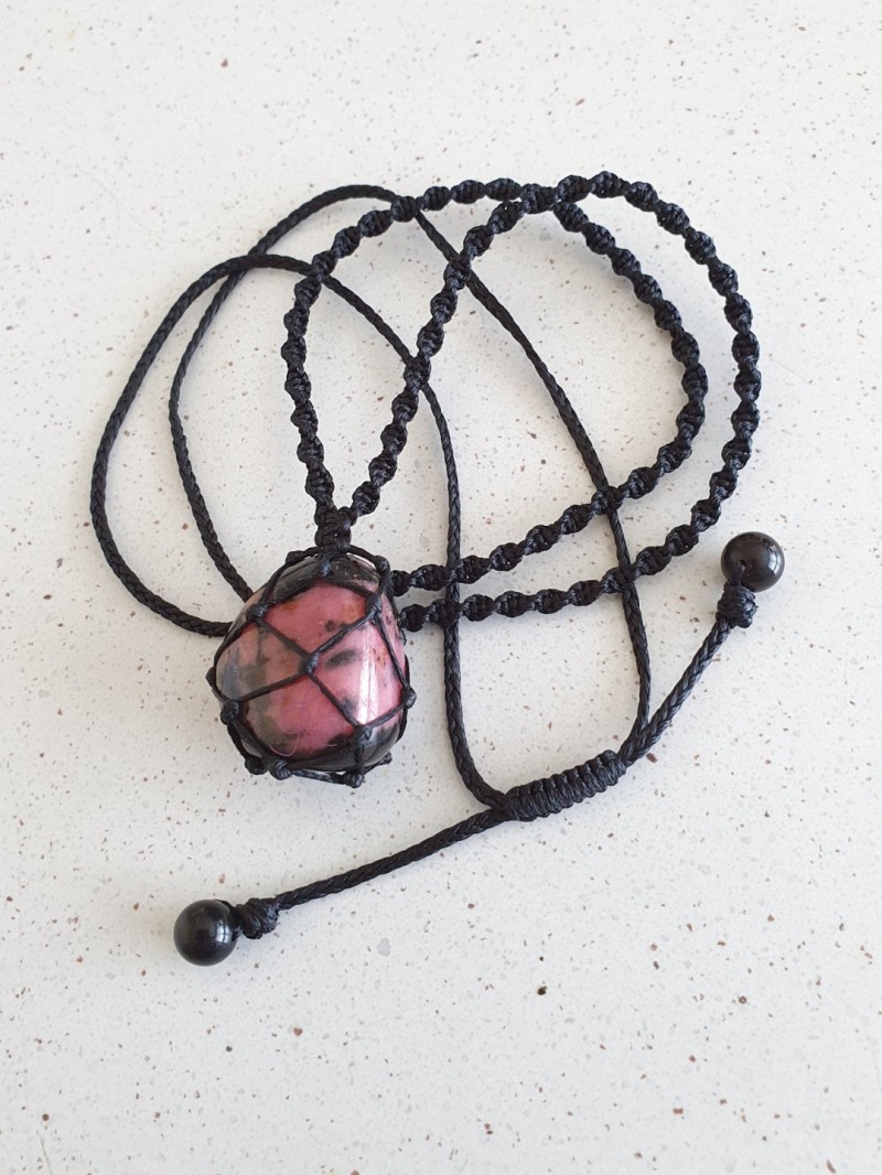Rhodonite crystal basket necklace and onyx beads with black narrow spiral adjustable macramé cord.