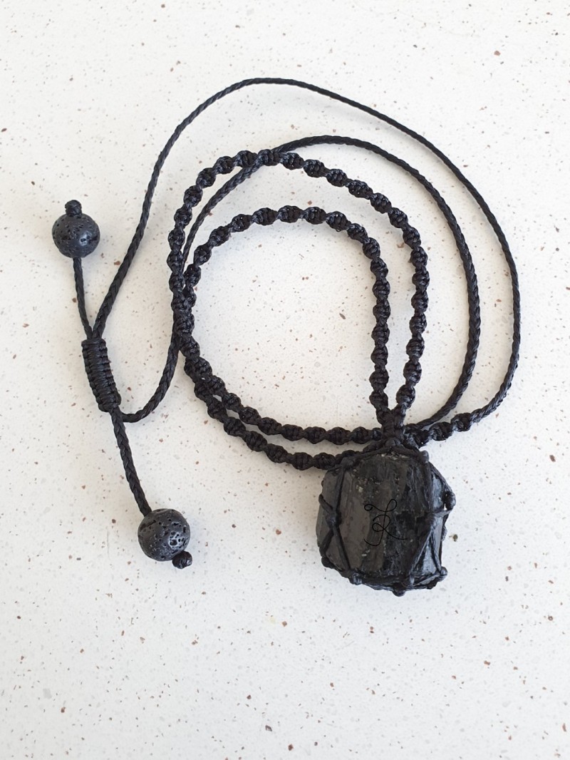 Raw black tourmaline crystal wide wrap necklace and black lava beads with black narrow spiral adjustable macramé cord.