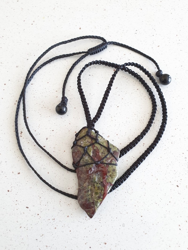 Dragon stone crystal necklace and onyx beads with black flat adjustable macramé cord.