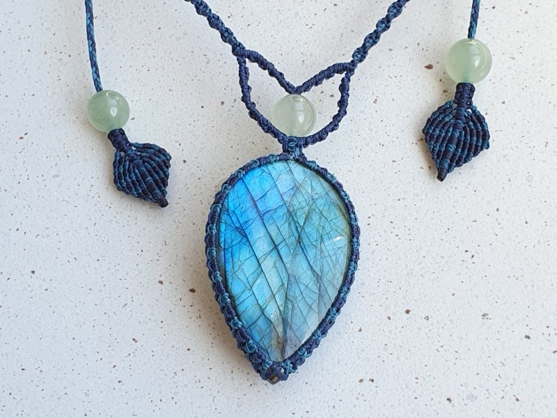 Gorgeous full flash Labradorite crystal and aventurine bead necklace with navy blue and teal coloured adjustable macrame cord.