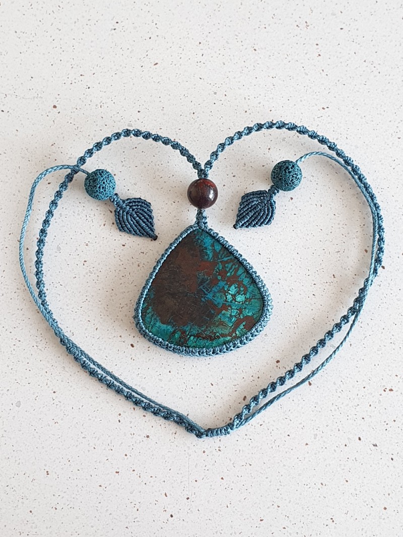 Chrysocolla crystal macrame necklace and brecciated jasper and lava beads with teal coloured narrow spiral adjustable macrame cord.