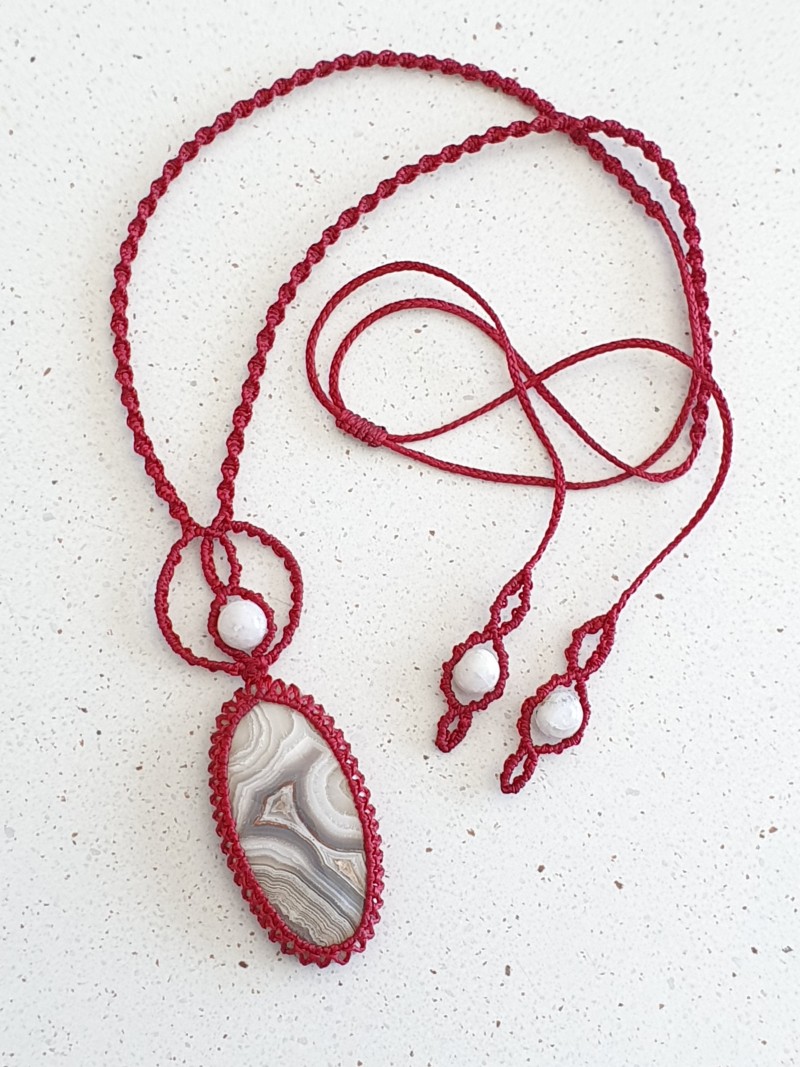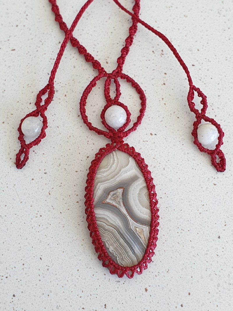 Crazy Lace Agate crystal and rainbow moonstone beads with burgundy narrow spiral adjustable macrame cord.