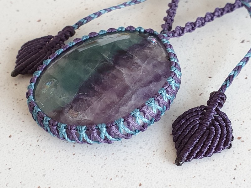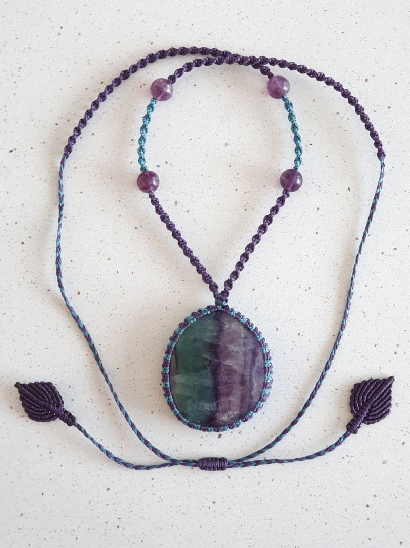 Rainbow fluorite crystal necklace and rainbow fluorite beads with dark purple and teal coloured narrow spiral adjustable macrame cord.