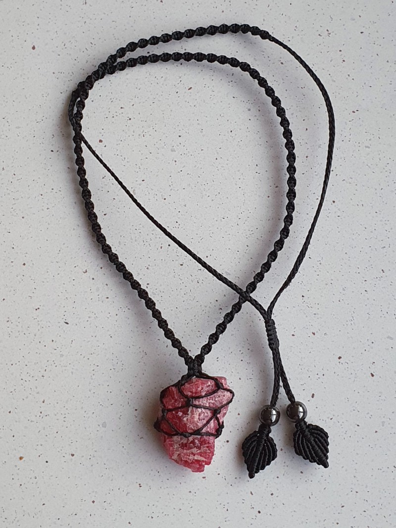 Pure raw Rhodonite crystal and Hematite bead macrame necklace with adjustable black narrow spiral macrame cord