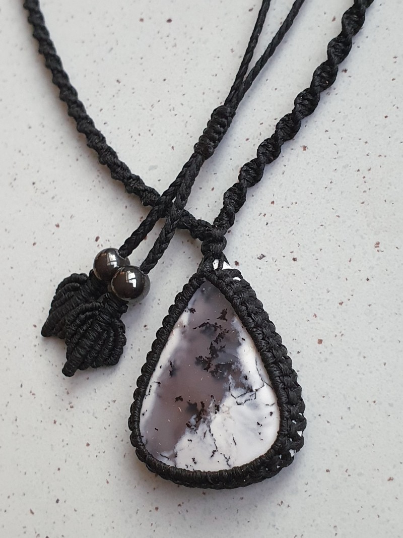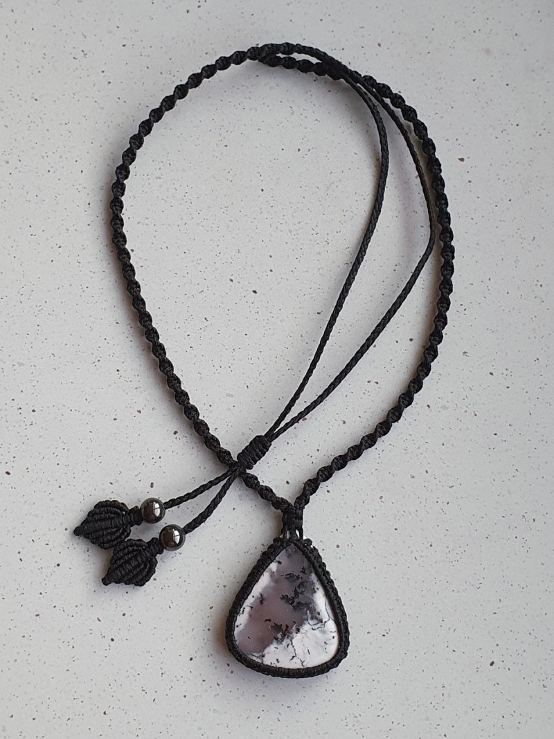 Dendritic Agate crystal and hematite bead macrame necklace with adjustable black narrow spiral macrame cord