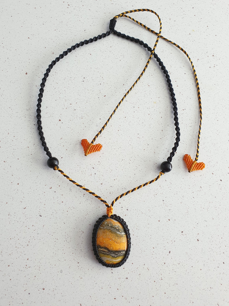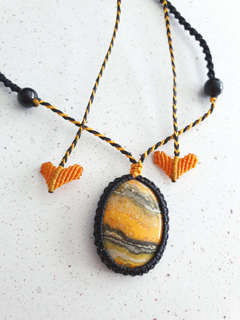 Bumblebee Jasper crystal macrame necklace and black obsidian beads with two tone black and yellow narrow spiral macrame cord with heart shaped toggles