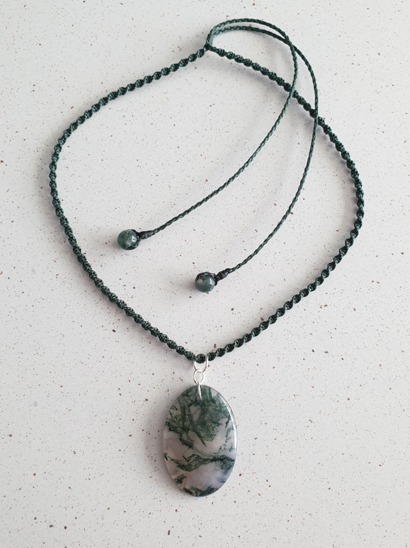 Moss agate crystal pendant with stirling silver findings and adjustable dark green narrow spiral macrame cord and moss agate bead toggles