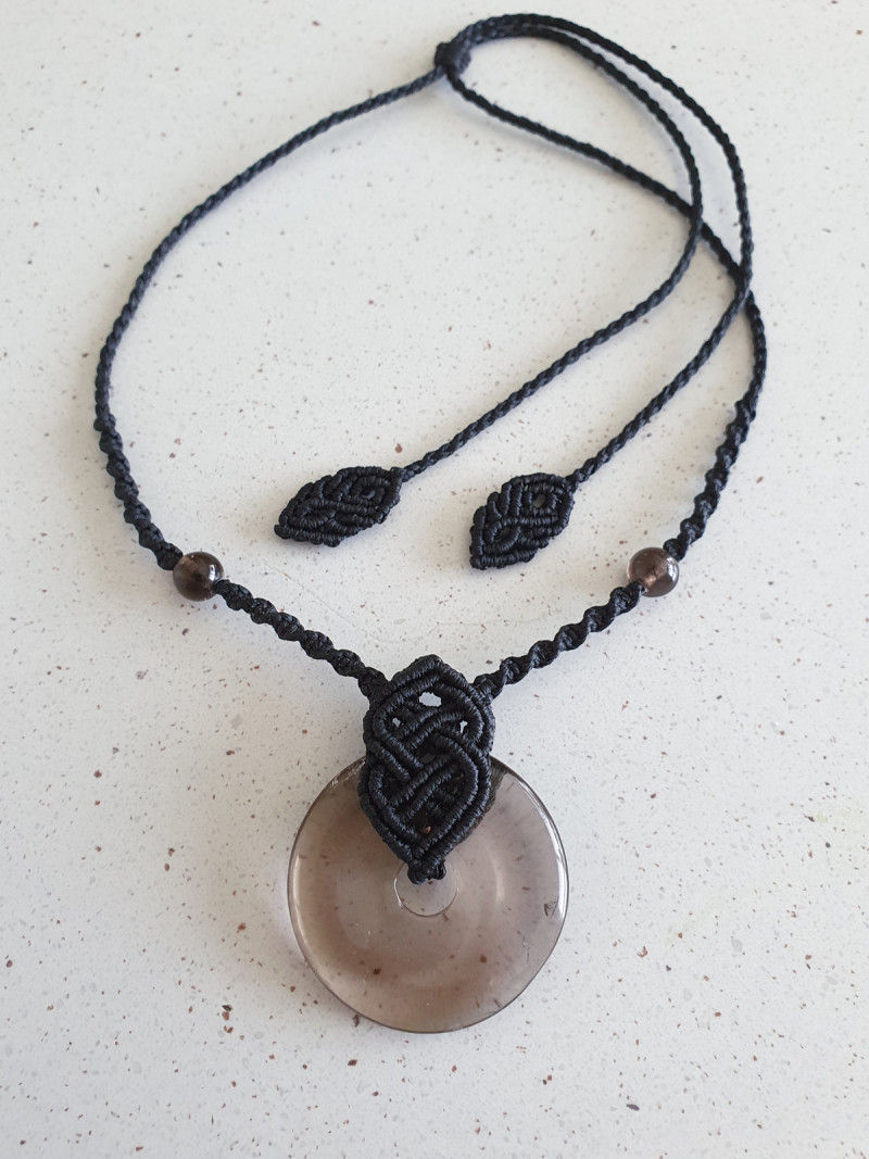 Smoky quartz crystal donut and beads wrapped in a black celtic inspired adjustable macrame necklace with detailed macrame toggles