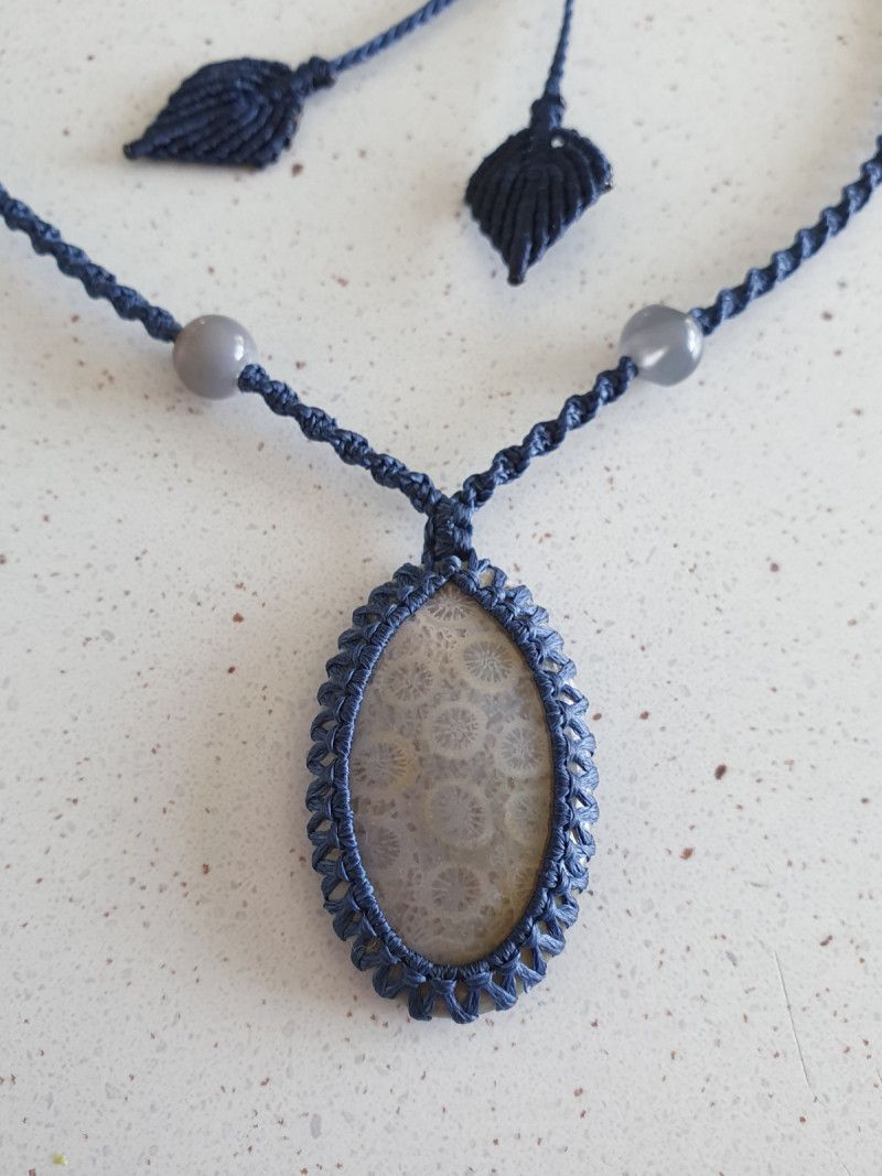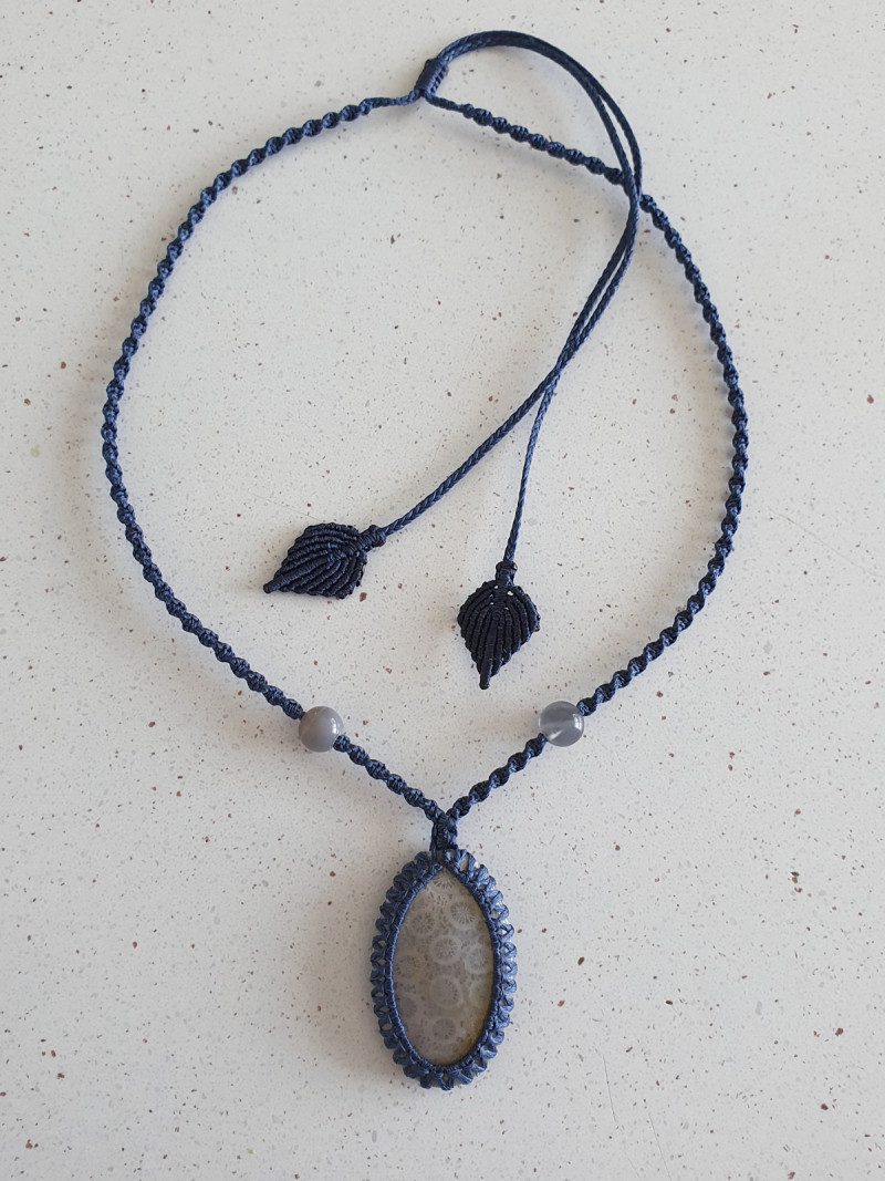 Fossil coral crystal with moonstone beads wrapped in a navy blue narrow spiral adjustable macrame necklace with leaf shaped toggles