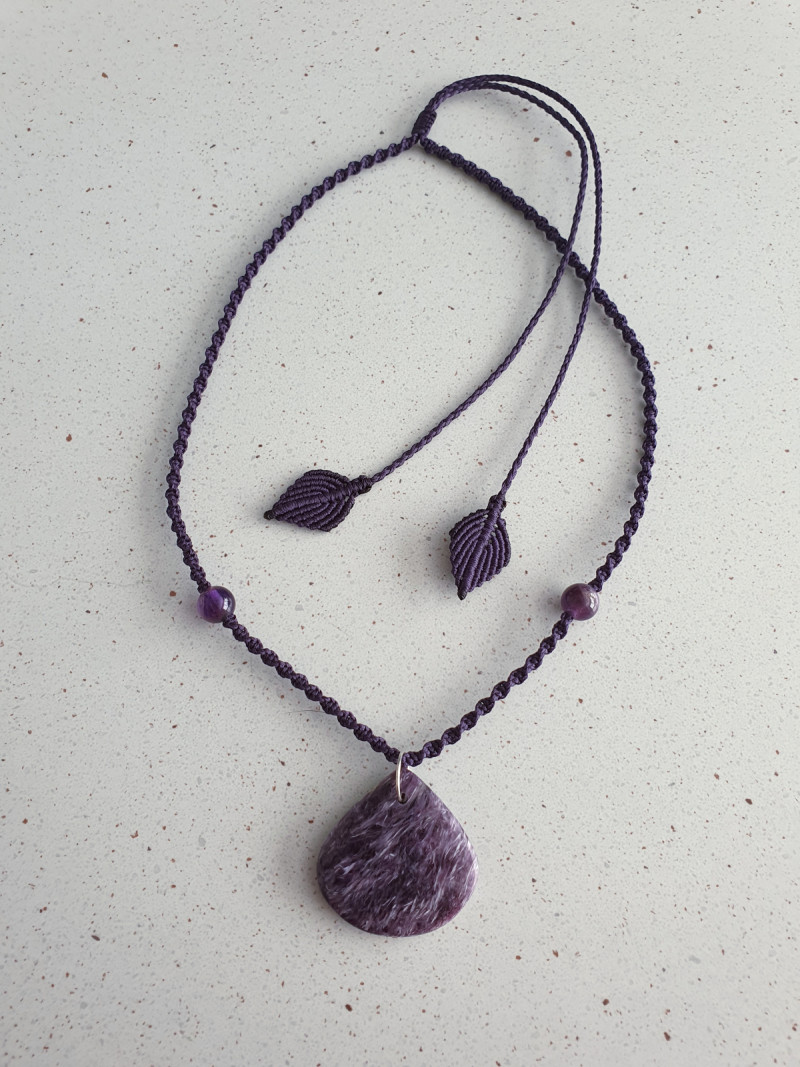 Charoite crystal cabochon pendant with amethyst beads, adjustable dark purple narrow spiral macrame cord, stirling silver jump ring and leaf shaped toggles