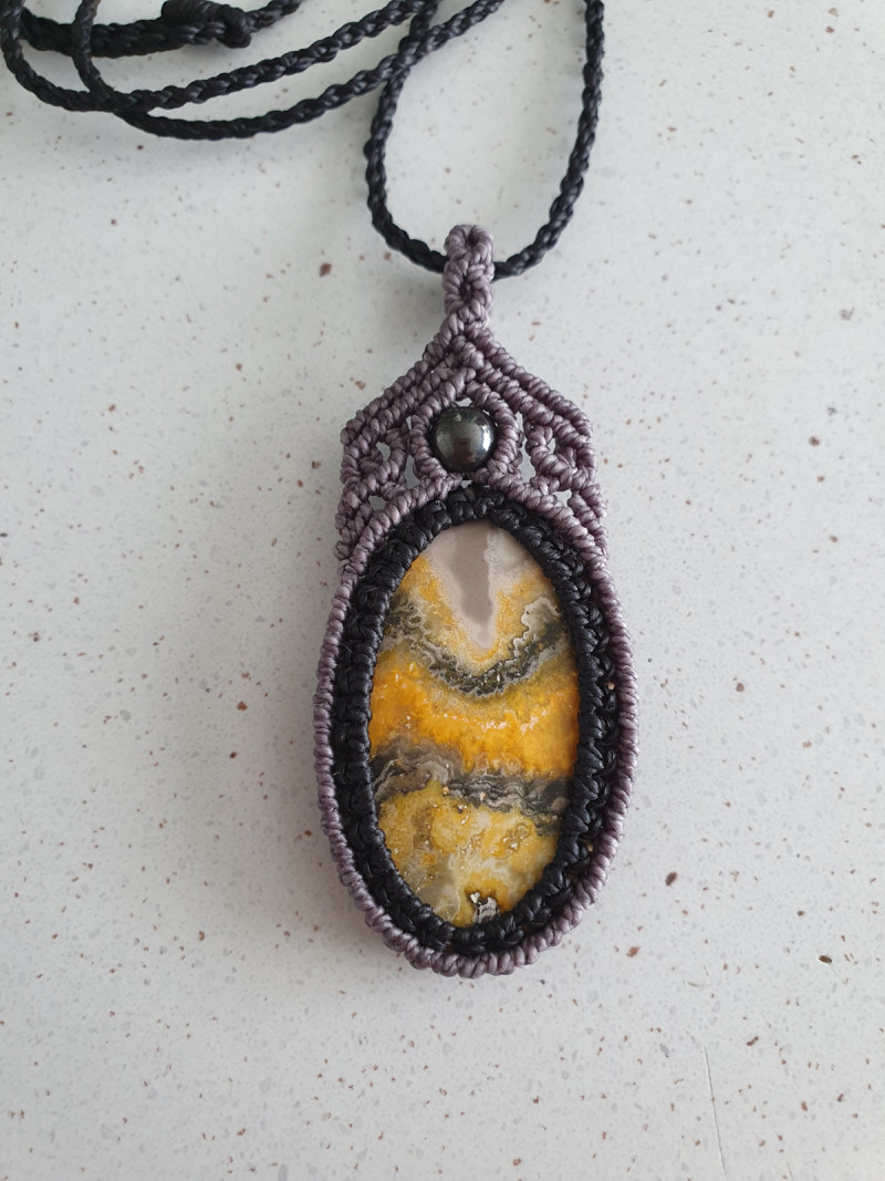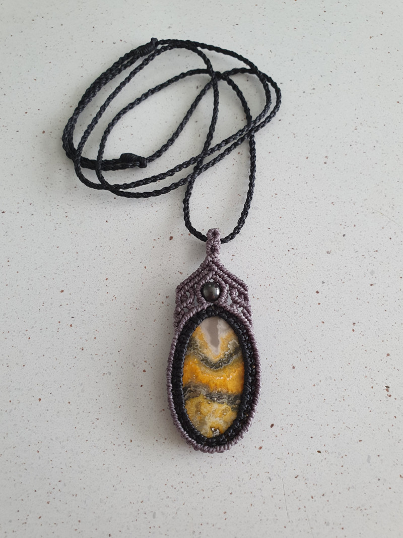 Bumblebee Jasper and hematite bead pendant with black and dark grey macrame wrap and black adjustable cord.