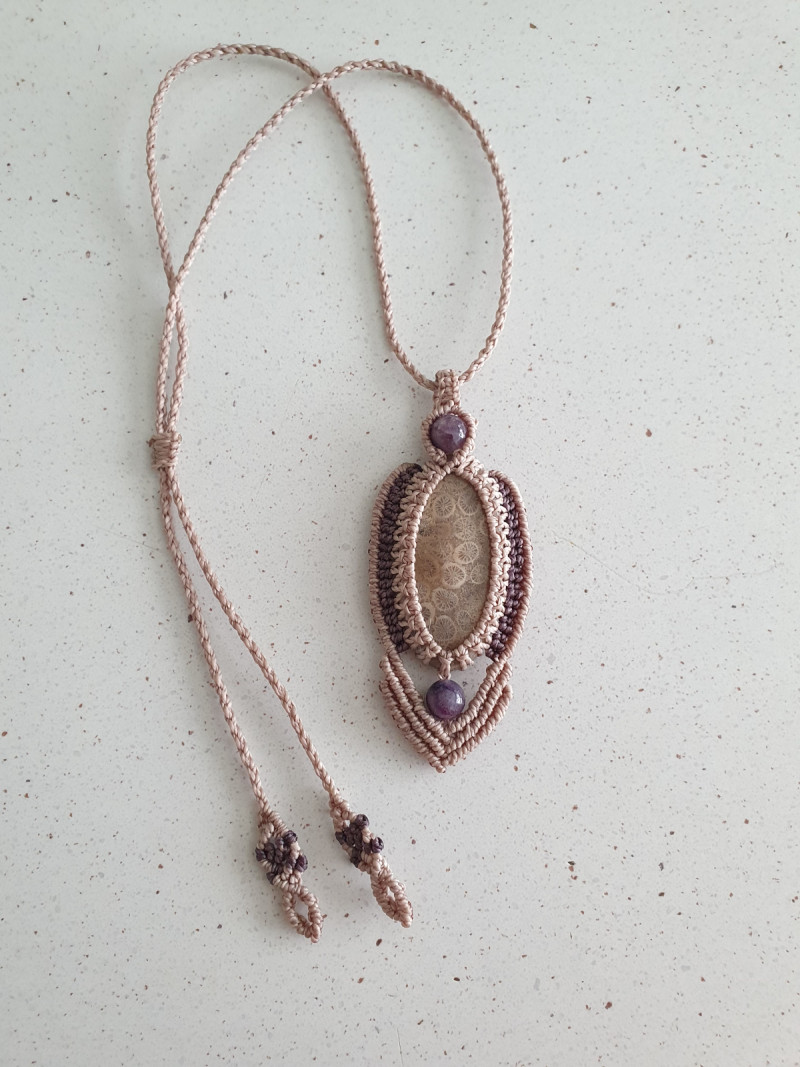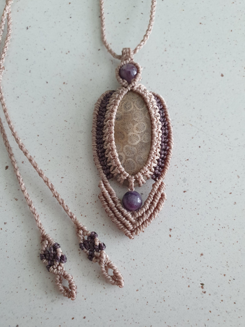 Coral Fossil crystal necklace and fluorite crystal beads with mauve and tan sand adjustable macrame cord.