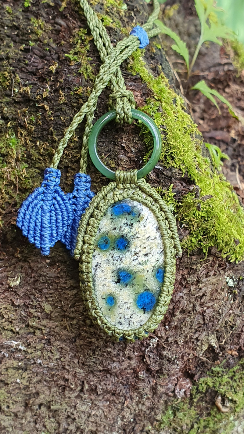 K2 crystal and NZ Greenstone ring combined with olive green and blue adjustable macrame cord and leaf detail toggles.