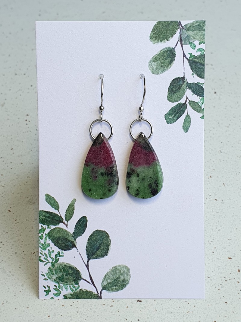 One-of-a-kind matched pair of Ruby Zoisite crystal earrings. Made with nickel free ear wires and tarnish resistant silver plated findings.