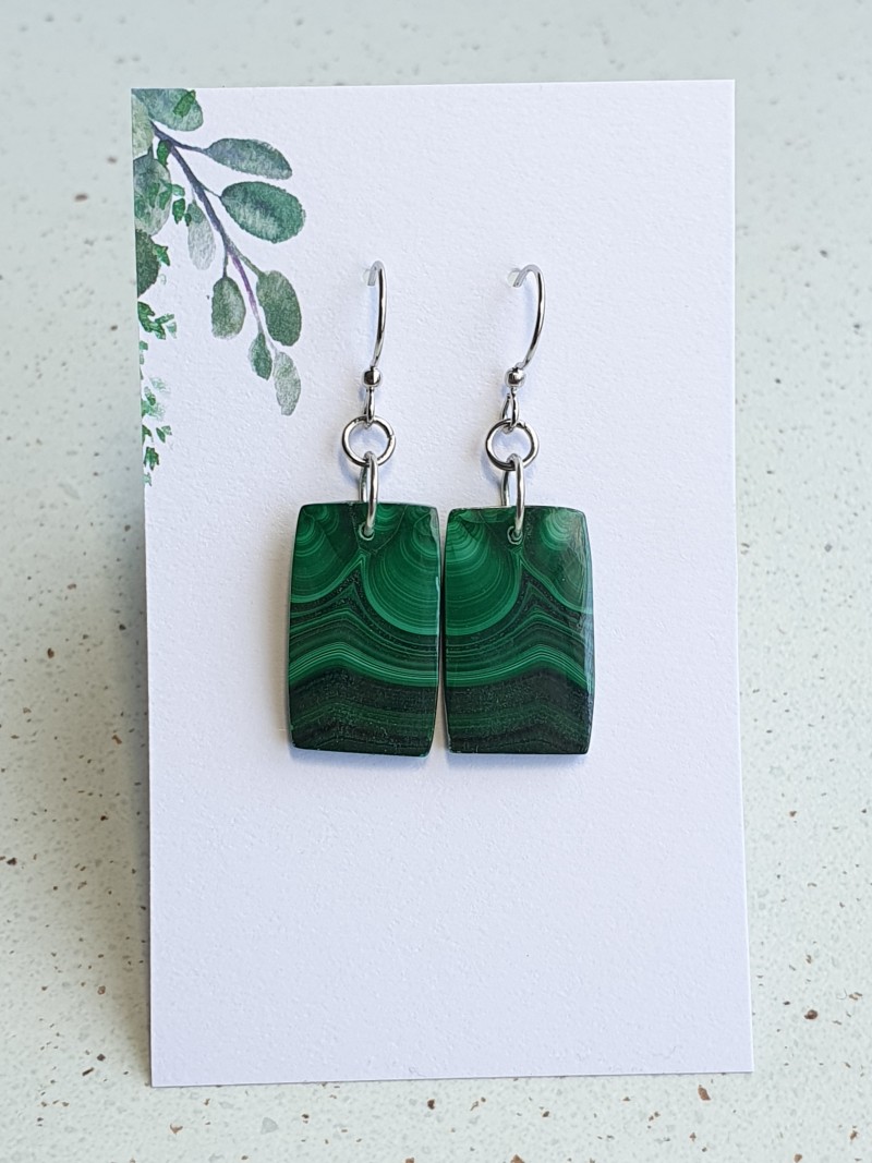 One-of-a-kind matched pair of AAA quality Malachite crystal earrings. Made with nickel free ear wires and tarnish resistant plated silver / stainless steel findings.