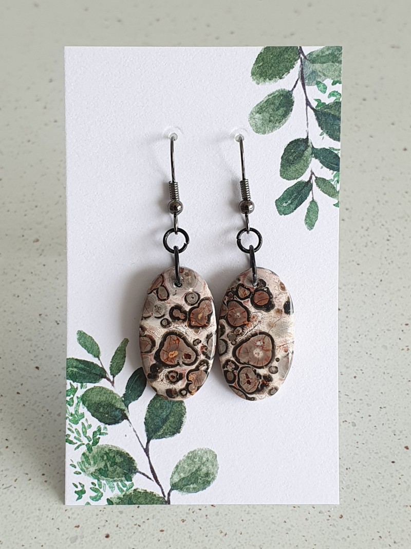 One-of-a-kind matched pair of Leopard Skin Jasper Crystal earrings. Made with nickel free gunmetal black plated ear wires.